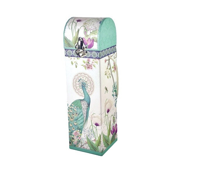 Cutia eleganta decorata cu motive de Paun este perfecta pentru a adauga un plus de rafinament oricarei sticle de vin oferita cadou. Suportul colorat turcoaz-alb in afara functiei de ambalare eleganta poate fi un articol de décor in orice spatiu.