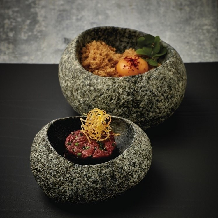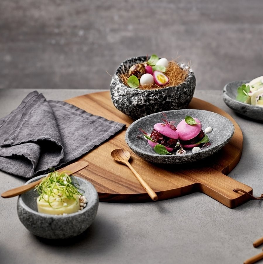 De ceva timp, ardezia este un favorit ferm in prezentările culinare. Bucatarilor le place sa foloseasca acest material atunci cand aranjeaza sushi, tapas sau peste. Fata de acest clasic peren adica ardezia, marmura sarbatoreste o renastere în gama trendy PLAYGROUND - mai ales în combinatie cu lemnul. Cei mai captivant din selectia actuala sunt bolurile din piatra naturala, culese si netezite manual. Ar fi greu sa ne apropiem de natura. Din cele mai vechi timpuri si în timpul Renașterii italiene, Terrazzo sa bucurat de o mare popularitate. Acum, Terrazzo s-a intors, este materialul in trend in designul interior! In combinatie cu preparate culinare aranjate ocazional si interactionand cu materiale precum portelanul sau lemnul, Terrazzo permite experiente unice in servirea mesei. Datorita procesului sau de productie, fiecare piesa are un aspect cu adevarat unic.