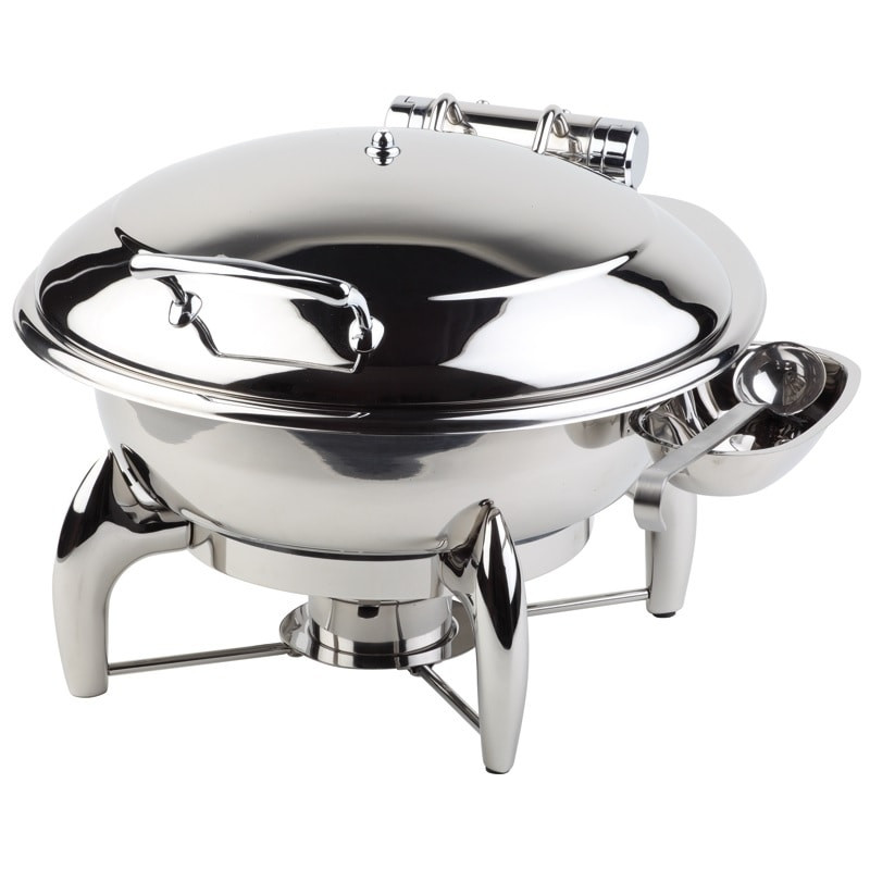 Cadru solid din inox 18/8, cu capac hidraulic detasabil, baza tip sandwich adaptata si pentru inductie, vascheta 6 litri Inox, cu suport pentru ustensile de servire si 1 suport spirt solid si inel de montare placa de inductie.