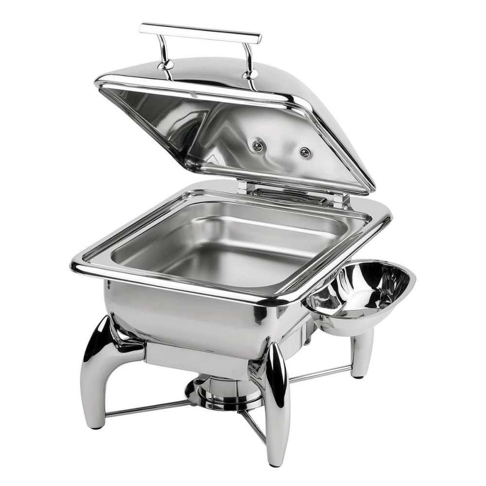 Cadru solid din inox 18/8, cu capac hidraulic detasabil, baza tip sandwich adaptata si pentru inductie, vascheta GN2/3-65 mm Inox, capacitate de 5.5 litri, cu suport pentru ustensile de servire, 1 suport spirt solid si inel de montare placa de inductie.