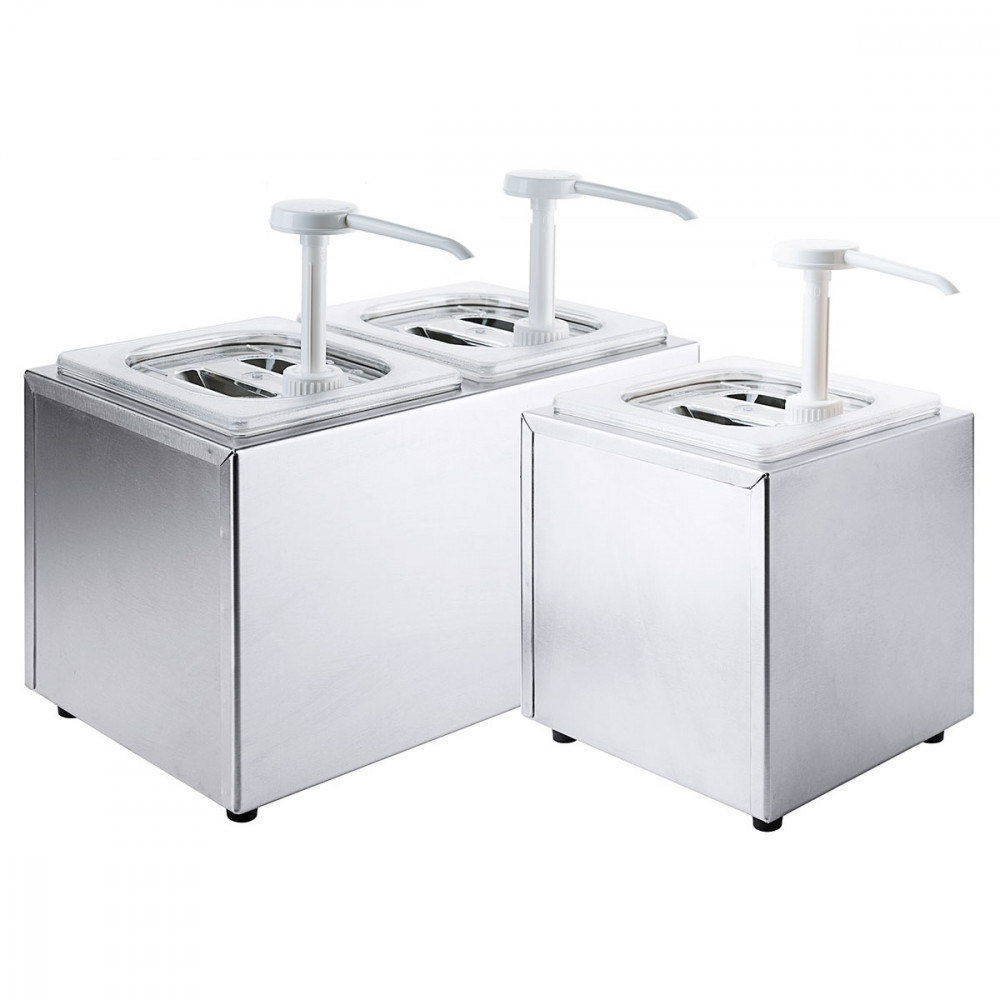 Carcasa este realizat din Inox cu picioare caucucate pentru aderenta mai mare, competat cu o cuva GN 16 din policarbonat cu inaltime de 10 cm si o pompa de 30 ml / apasare.