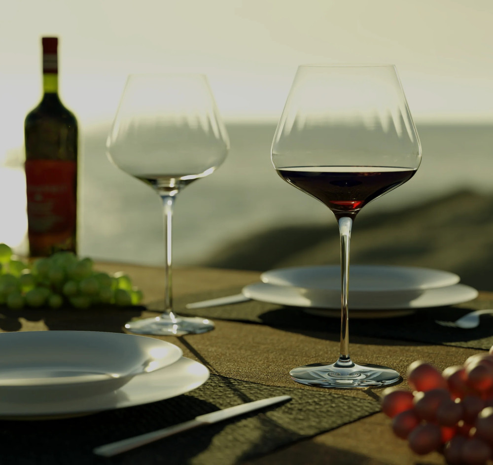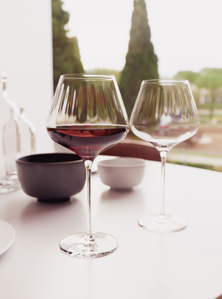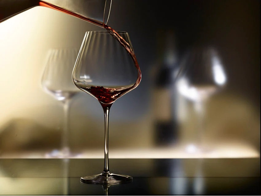 Paharele extravagante burgundy din seria Symphony ies in evidenta prin contururile lor clare. Ei conving prin designul lor strict functional, dar si puternic accentuat. Peretii extrem de subtiri ai paharelor sunt traversati de texturi verticale fine, care nu numai ca au un aspect atragator, dar maresc si suprafata interioara a paharului, permitand dezvoltarea libera a aromelor.