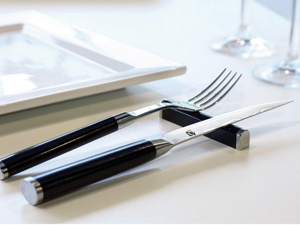 Setul este alcatuit din cutit steak (GTC-DM-0711-KAI) + furculita si suport tacamuri .