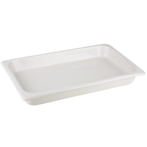 Tava din portelan termorezistent GN 1/1, cu o intaltime de 6 cm si un volum de 7.1 litri, culoarea alba.