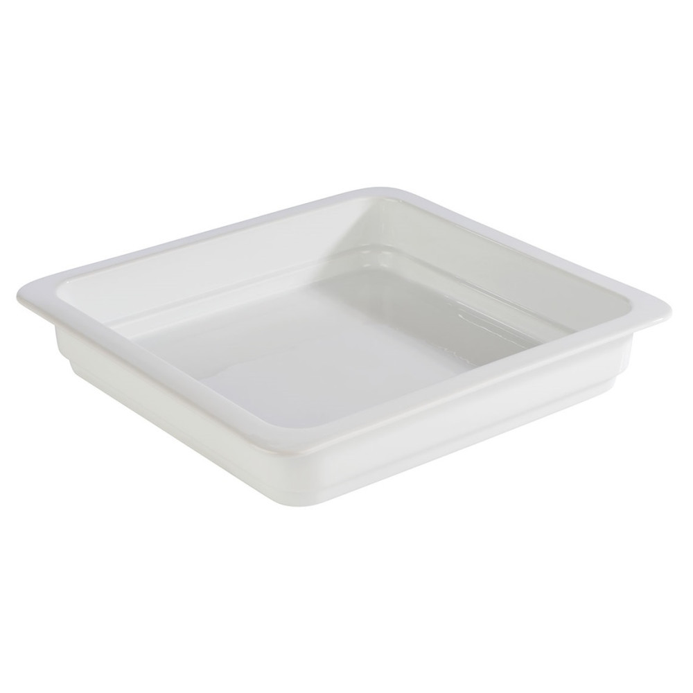 Tava din portelan termorezistent GN 2/3, cu o intaltime de 6 cm si un volum de 4.6 litri, culoarea alba.