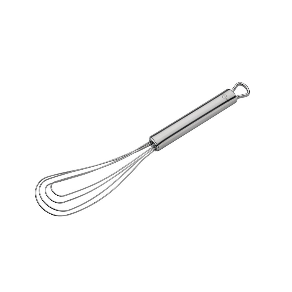 Telul plat este ustensila ideala pentru obtinerea compozitiilor echilibrate si perfect omogene. Poate fi utilizat la baterea oricarei tip de omleta, amestecarea cremelor. Confectionat complet din inox este foarte eficient si durabil. Manerul ergonomic, de forma triunghiulara, asigura o prindere constanta si confortabila in timpul utilizarii.
