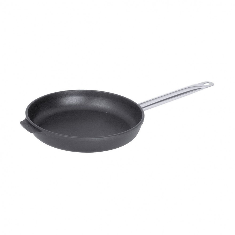 Tigaie Titanium rotund 24 cm cu maner Inox, din aluminiu turnat conceputa pentru utilizare intensa in bucatariile din restaurante sau hoteluri, cantine, catering cat si in bucataria proprie. Datorita conductivitatii inalte a aluminiului turnat, peretii vasului se incalzesc repede si uniform, au greutate redusa si sunt rezistente la temperaturi ridicate. Sunt excelente pentru gatit pe aragaz si in cuptor. Aderenta stratului anti-lipire este imbunatatita printr-un strat de titan intre aluminiu si stratul anti-lipire, aceasta procedura cu doua straturi imbunatateste durata de viata a stratului anti-lipire si asigura o rezistenta suplimentara la zgarieturi. Prin aplicarea unei plasme de fier, unele modele pot fi folosite si pe surse de incalzire prin inductie.