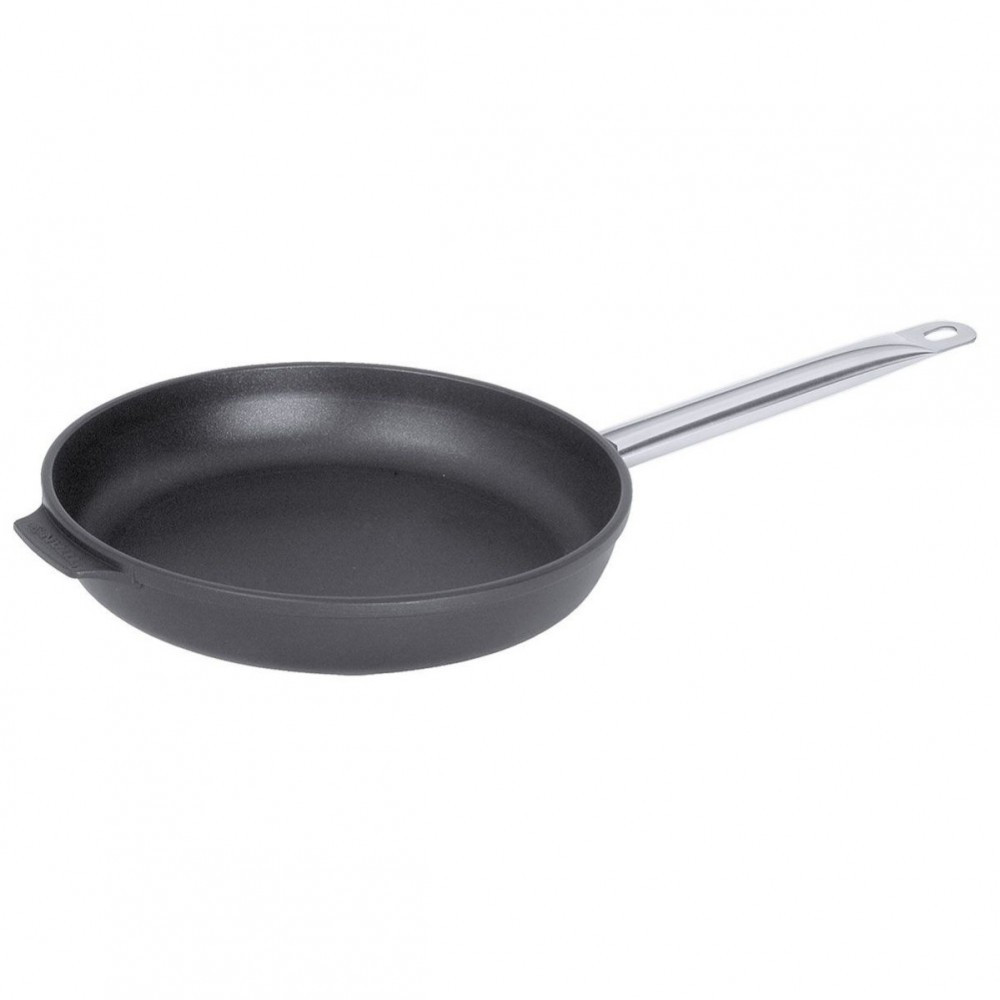 Tigaie Titanium rotund 32 cm cu maner Inox, din aluminiu turnat conceputa pentru utilizare intensa in bucatariile din restaurante sau hoteluri, cantine, catering cat si in bucataria proprie. Datorita conductivitatii inalte a aluminiului turnat, peretii vasului se incalzesc repede si uniform, au greutate redusa si sunt rezistente la temperaturi ridicate. Sunt excelente pentru gatit pe aragaz si in cuptor. Aderenta stratului anti-lipire este imbunatatita printr-un strat de titan intre aluminiu si stratul anti-lipire, aceasta procedura cu doua straturi imbunatateste durata de viata a stratului anti-lipire si asigura o rezistenta suplimentara la zgarieturi. Prin aplicarea unei plasme de fier, unele modele pot fi folosite si pe surse de incalzire prin inductie.