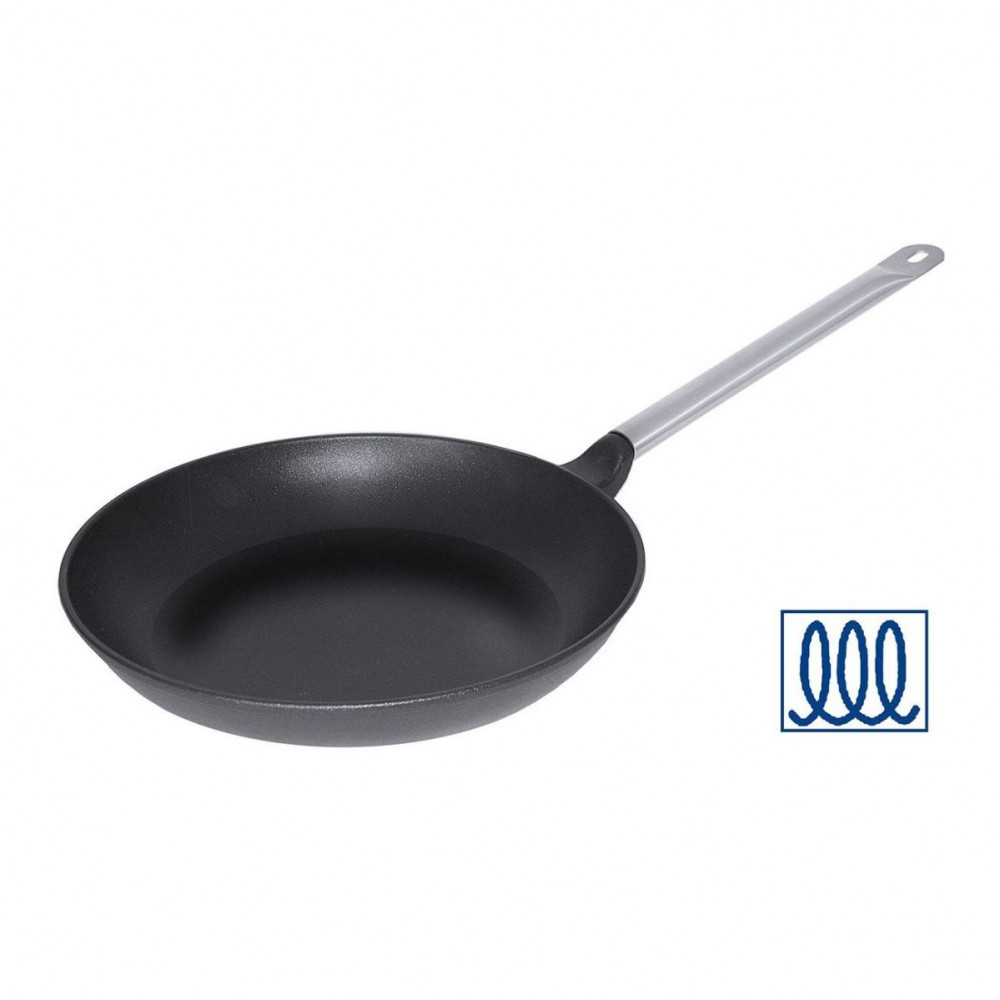 Tigaie Titanium rotund 40 cm cu maner Inox, din aluminiu turnat conceputa pentru utilizare intensa in bucatariile din restaurante sau hoteluri, cantine, catering cat si in bucataria proprie. Datorita conductivitatii inalte a aluminiului turnat, peretii vasului se incalzesc repede si uniform, au greutate redusa si sunt rezistente la temperaturi ridicate. Sunt excelente pentru gatit pe aragaz si in cuptor. Aderenta stratului anti-lipire este imbunatatita printr-un strat de titan intre aluminiu si stratul anti-lipire, aceasta procedura cu doua straturi imbunatateste durata de viata a stratului anti-lipire si asigura o rezistenta suplimentara la zgarieturi. Prin aplicarea unei plasme de fier, unele modele pot fi folosite si pe surse de incalzire prin inductie.