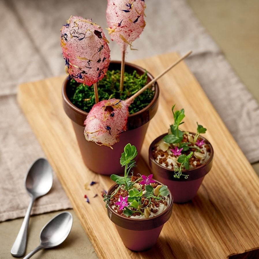 O companie rustica la masa. Sosuri intr-un ghiveci de flori? Ametitor la PLAYGROUND! Materialul neincetat, traditional, emana caldura confortabila si flirul mediteranean. O provocare fermecatoare care este perfecta pentru espresso, aperitive si deserturi.